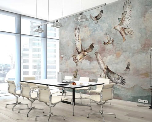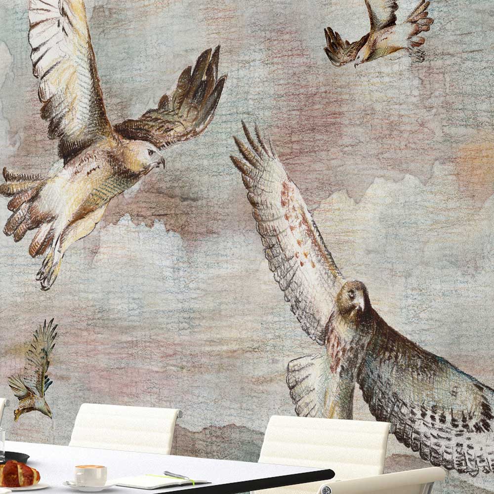 HORUS è una carta da parati evocativa e spirituale, in cui il cielo diventa protagonista e i rapaci in volo tracciano rotte silenziose sopra montagne lontane.