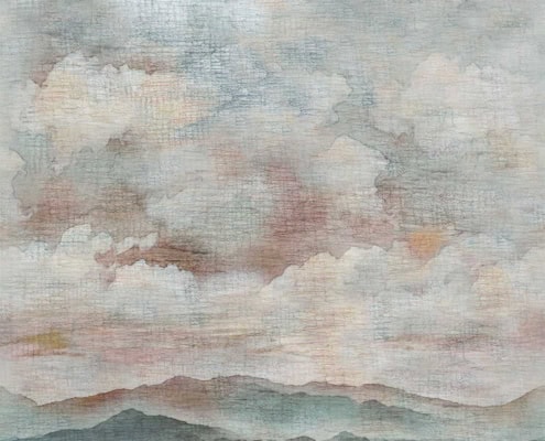 Il fondo acquerellato, delicato ma profondo, è ispirato a nuvole, nebbie e paesaggi sfumati.