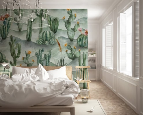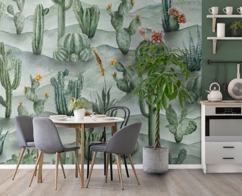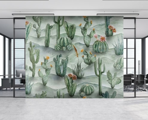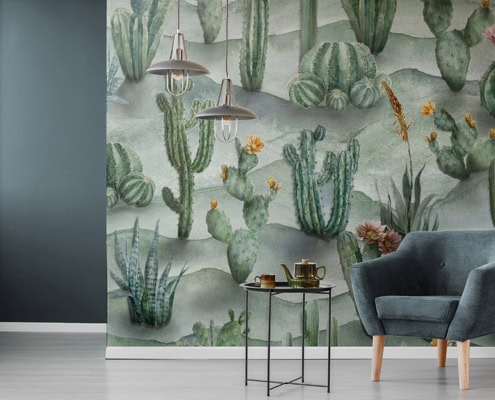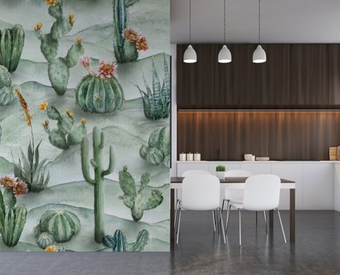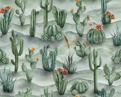 Kaktus è una carta da parati dal tono illustrativo e botanico, che ritrae con grazia e dettaglio un paesaggio desertico popolato da cactus di varie forme e fioriture. L’effetto acquerellato delle texture ammorbidisce i tratti spinosi, dando vita a un equilibrio poetico tra la forza del deserto e la delicatezza del segno.