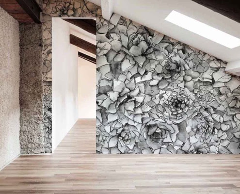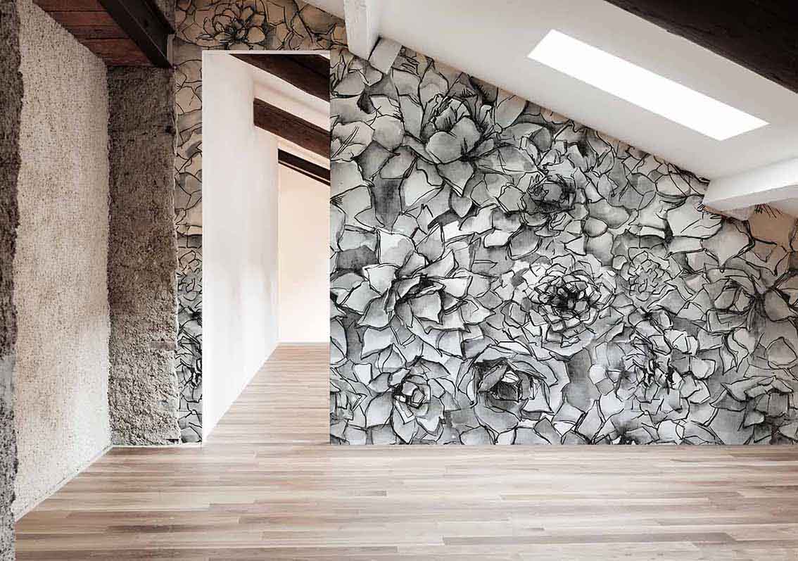 Mikao è una collezione di carte da parati che celebra la struttura delle piante succulente con un tratto grafico distintivo. Le rosette vegetali, fitte e modulari, sono illustrate con contorni netti, quasi incisi, e acquerelli sovrapposti che le rendono vibranti, leggere e raffinate.