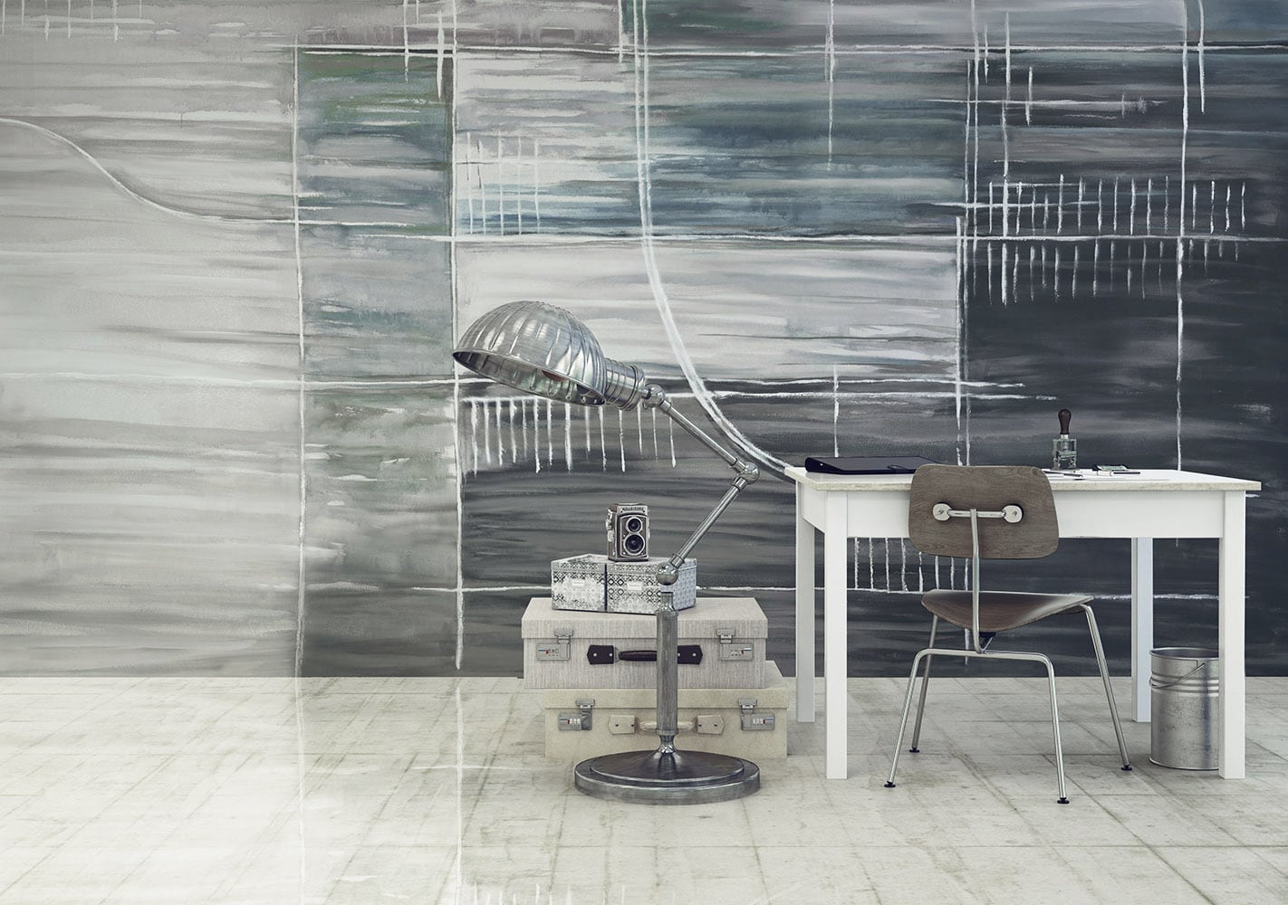 Painted Grid è una carta da parati astratta e pittorica, che unisce la forza del segno geometrico alla fluidità della materia cromatica.