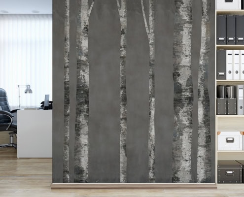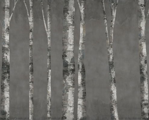 Silvatica è una collezione di carte da parati che immerge in un bosco grafico e minimale. Le betulle, stilizzate e materiche, si stagliano in verticale come segni tracciati nella nebbia. I fondi sono polverosi, profondi, desaturati: sfumano tra il verde, il tortora, il carbone e il ghiaccio.