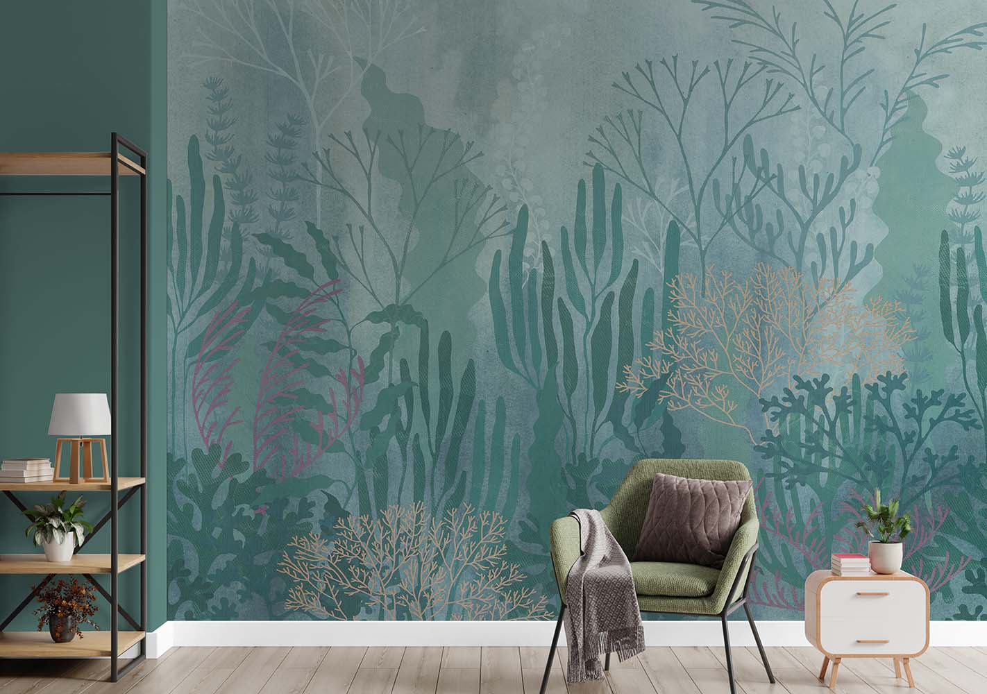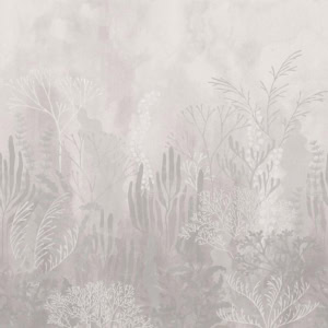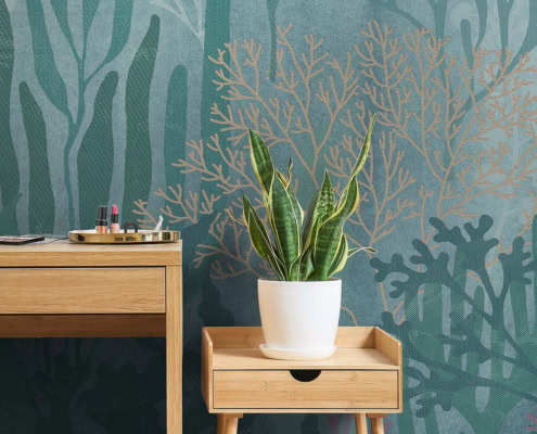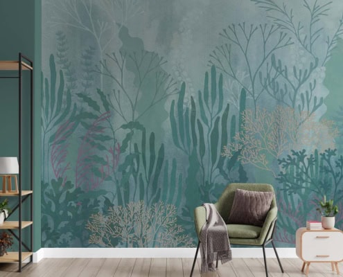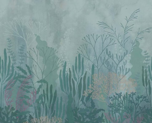 Wallpaper artistico ispirato ai fondali marini. Un’immersione nel blu tra flora oceanica e sogno, in chiave delicata e attuale.