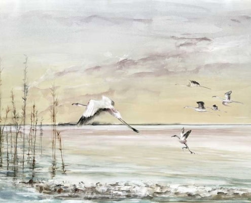 Water Heron racconta il fascino di un paesaggio lacustre sospeso nel tempo. La scena si sviluppa su un fondale acquarellato che fonde acqua, cielo e terra in sfumature morbide e luminose. Gli aironi, eleganti e maestosi, solcano il cielo o si posano sull’acqua, portando movimento e vitalità al panorama.